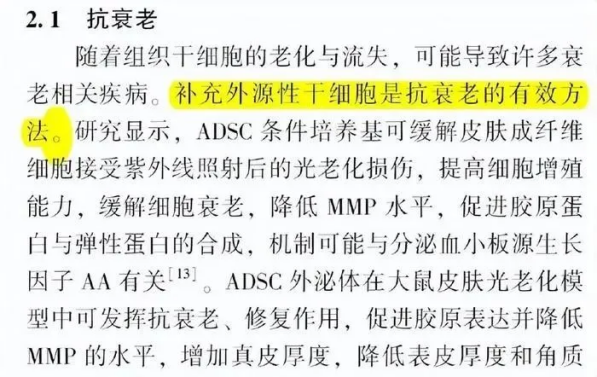 我國《協和醫學雜志》發布的《間充質干細胞在整形美容領域的應用》[6]提到,“隨著組織干細胞的老化與流失,可能導致許多衰老相關疾病。補充外源性干細胞是抗衰老的有效方法。”