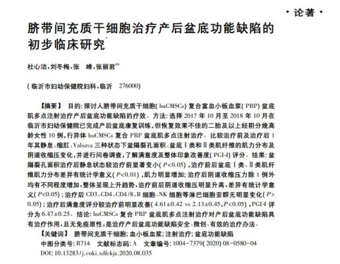 《現代婦產科進展》[2]上發表了一項人臍帶間充質干細胞(huCMSCs)治療產后盆底功能缺陷的初步臨床研究。在10位高齡、二胎、盆底功能缺陷且產后盆底康復訓練無效的女性中,采用huCMSCs復合富血小板血漿(PRP)治療后效果顯著,盆底功能得到有效恢復。