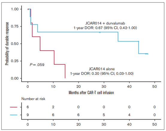 CD19CAR-T + durvalumab或者CD19CAR-T 單獨治療后患者DOR。持續緩解時間(DOR)