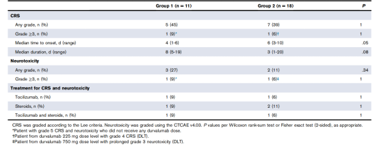 患者分成2組,如圖1所示,1組患者最初在CD19CAR-T后21天內 開始接受第一劑量的durvalu單抗。在安全性分析后,隨后的患者在CD19CAR-T后7天開始接受durvalu單抗治療。2組患者在CD19CAR-T給藥前 1天首次給予durvalu單抗。第1組和第2組首次輸注durvalu單抗的劑量水平列于表1。對于兩組,在注射CD19CAR-T輸注后,以確定的最高安全劑量給予至多10個周期,直到不可接受的毒性或疾病進展 。