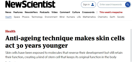 一則來自NewScientist的報(bào)道,研究人員開發(fā)出一種方法,可以將皮膚細(xì)胞“年輕”30歲,從成熟細(xì)胞中制造干細(xì)胞,未來可用于針對(duì)皮膚相關(guān)的疾病。
