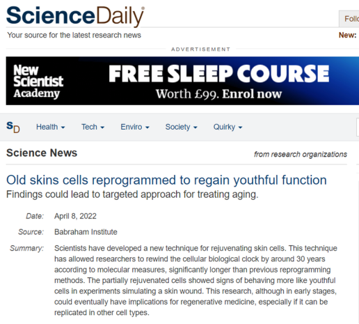 英國劍橋的科學(xué)家們發(fā)明了一種技術(shù),利用山中因子使皮膚細(xì)胞恢復(fù)活力的同時(shí)又不失去它們以前的功能。研究人員收集了三名平均年齡在50歲左右的供體皮膚細(xì)胞樣本,然后將這些細(xì)胞暴露在山中因子中13天,以部分地延緩細(xì)胞衰老。然后去除山中因子,讓細(xì)胞生長(zhǎng)。