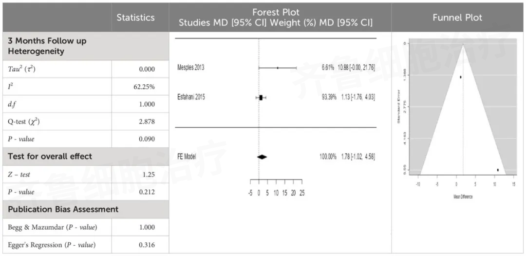 研究結果:與基線相比,MSC治療組在最后一次隨訪時的HbA1c顯著降低(MD: 0.95,95% CI: 0.33至1.57,P-值:0.003< 0.05),患者的胰島素需求顯著較低(MD: 0.19,95% CI: 0.07至0.31,P-值:0.002< 0.05),與基線相比,MSC移植的FBG水平顯著下降(MD: 1.78,95% CI: -1.02至4.58,P-值:0.212),MSC治療組的FPG水平顯著較低(MD: -0.77,95% CI: -2.36至0.81,P-值:0.339 > 0.05),并且MSC治療組的空腹C肽水平略高(MD: -0.02,95% CI: -0.07至0.02,P-值:0.231 > 0.05)。
