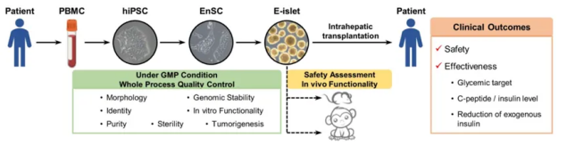 2024年4月30日,來自海軍軍醫大學上海長征醫院和中國科學院分子細胞科學卓越創新中心的研究團隊在權威雜志Cell Discovery(中科院1區,IF=33.5)在線發表最新研究成果。如下圖所示[5],研究人員通過創新性地利用患者的血液PBMC重編程為自體iPSC細胞,進一步誘導成為內胚層干細胞(EnSC),最終在體外再造胰島組織(E-islet)。
