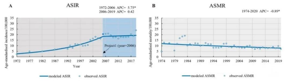 研究顯示,雖然中國CRC發(fā)病率在逐漸上升,但增速已有所放緩,從1972年的2.75/10萬人年攀升至2019年的19.39/10萬人年。而與此同時(shí),死亡率則呈小幅下降趨勢,從1974年的12.00/10萬人年降至2020年的7.95/10萬人年。