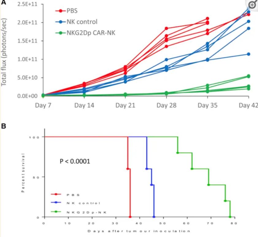 對攜帶腫瘤的小鼠注射NK細(xì)胞3周后,其不僅在研究實(shí)驗(yàn)期間腫瘤發(fā)展情況有所減輕,同時(shí)與未接受治療的對照組相比,其中位生存時(shí)間顯著延長了92%。