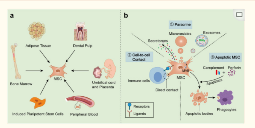 圖1.MSC的來源和MSC發揮免疫調節作用的途徑