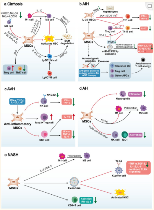 由于MSC的免疫調節可塑性及其在修飾后遞送免疫調節劑的能力,MSC可以在炎癥性肝病中發揮免疫抑制作用,包括(a)肝硬化、(b)AIH、(c)AVH、(d)AH和(e)NASH,從而改善免疫介導的肝損傷、肝臟炎癥和纖維化。