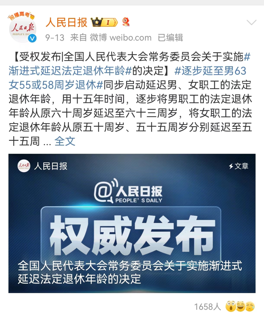 圖 | 人民日?qǐng)?bào)發(fā)布“延時(shí)退休”政策
