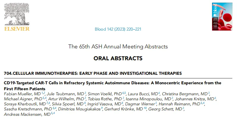 2023年12月9日,在圣地亞哥舉行的美國血液學學會年會上,德國埃爾朗根-紐倫堡大學的一位博士報告了一項最新研究數據,15名自身免疫疾病患者(8名系統性紅斑狼瘡患者、4名系統性硬化癥患者和3名特發性炎性肌病患者)在接受CAR-T細胞的應用后,他們不再出現癥狀或不再需要進行新的治療,其中第一批患者已經保持了兩年多無病狀態,這一結果讓人們燃起了希望。