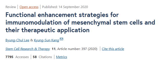 2020年12月,美國國立衛生研究院Byung-Chul Lee的研究團隊在Stem Cell Research & Therapy雜志上發表題為“Functional enhancement strategies for immunomodulation of mesenchymal stem cells and their therapeutic application”的綜述長文。文中提出了預處理、基因改造、生物支持材料應用以及聯合用藥等幾大策略。在MSCs給藥前,使用包括細胞因子、生長因子和天然免疫受體激動劑等生物活性物質;缺氧條件誘導甚至采用改進的培養方法,均為有效的提高MSCs療效的策略。另一方面,將MSCs基因進行改造或和生物相容性材料聯合應用也有望成為更優的治療策略。與此同時,開展特異性針對某類疾病或某位患者的個性化治療變得愈發重要。