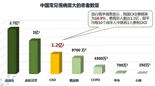 據統計,我國腎病的發病率為10%~13%,其中慢性腎臟病(CKD)患病率達10.8%,且多數腎損傷易進展為慢性甚至急性腎功能衰竭,即尿毒癥。也就是說,10個人中就有1人患腎病。每年造成500萬至1000萬人死亡,引起了醫學界的關注與重視。