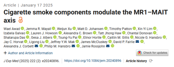 近日,澳大利亞莫納什大學等機構的科學家在國際雜志Journal of Experimental Medicine上發表了題為“Cigarette smoke components modulate the MR1–MAIT axis”的研究報告,其中揭示了香煙煙霧和電子煙中發現的多種化學物質是如何改變肺部關鍵類型的免疫細胞功能的機制。