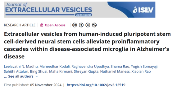 2024年11月,美國德克薩斯農工大學醫學院的研究人員在《細胞外囊泡雜志》上發表文獻,來自人類誘導多能干細胞衍生的神經干細胞的細胞外囊泡可減輕阿爾茨海默病中與疾病相關的小膠質細胞內的促炎級聯反應。