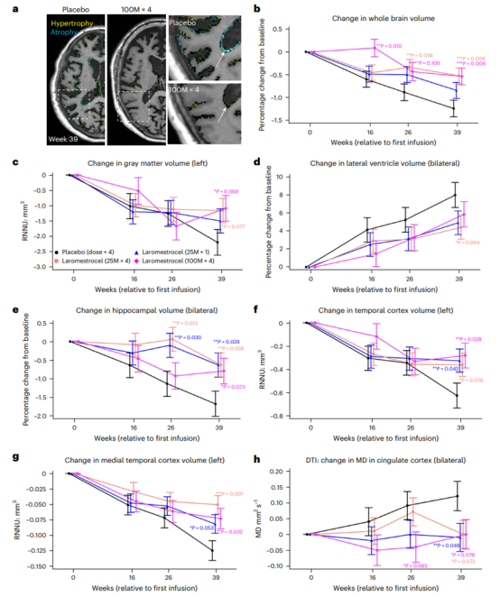此項研究納入了49例的輕度阿爾茨海默病(AD)受試者,取得了突破性進展:不僅使全腦體積減少的速率減緩了48.4%,還使得患者海馬體的萎縮速度降低了61.9%,整個過程未出現任何淀粉樣蛋白相關影像異常(ARIA)的安全問題。