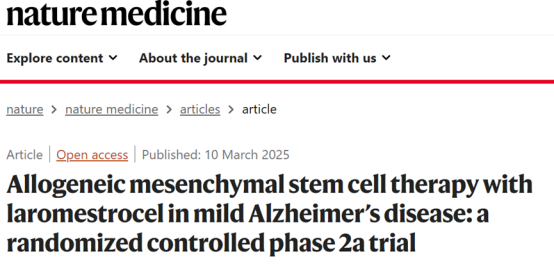 “Nature Medicine“上發表了一篇名為“Allogeneic mesenchymal stem cell therapy with laromestrocel in mild Alzheimer’s disease: a randomized controlled phase 2a trial”的II期臨床試驗結果,展示了使用間充質干細胞技術應對輕度AD的II期臨床試驗結果。