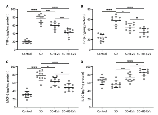 該研究表示人臍帶間充質干細胞外泌體可顯著上調海馬區HSP70表達,并通過抑制TLR4/NF-κB通路降低促炎因子(TNF-α、IL-1β)水平,緩解睡眠剝奪小鼠的神經炎癥。
