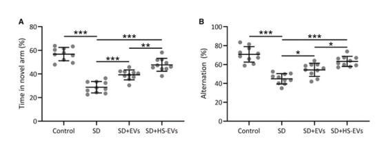 此項研究中,研究人員調查了熱休克預處理的人臍帶間充質干細胞衍生的外泌體對小鼠睡眠剝奪引起的認知障礙的潛在效果。在這個測試中,新臂停留時間和自發交替次數被用作認知功能的指標。