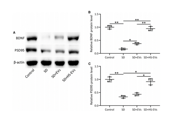 研究人員收集了海馬組織進行蛋白質分析,檢測了關鍵突觸可塑性相關分子——即突觸后密度蛋白95(PSD95)和腦源性神經營養因子(BDNF)的蛋白表達。研究結果表明,用熱休克預處理的hUC-MSCs衍生的EVs治療導致PSD95 (p=0.017)和BDNF(p=0.002)的表達顯著增加。