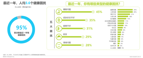 據《2024年情緒與健康睡眠白皮書》上的統計數據,在接受調查的人群當中,95%表示最近一年有過健康困擾,人均3.6個健康困擾,擔憂普漲。其中,睡眠問題最為突出。