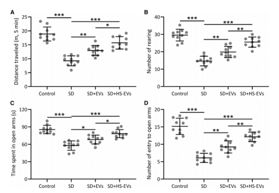 結(jié)果顯示,通過增加行走距離、繁殖次數(shù)、在開放臂中花費的時間,以及進(jìn)入開放臂的條目證實,接受熱休克處理的人臍帶間充質(zhì)干細(xì)胞外泌體顯著減輕了睡眠剝奪引起的焦慮樣行為。
