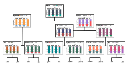 這項研究通過圖表顯示了百歲老人和其他年齡群體免疫細胞組成的顯著差異,特別是在髓樣細胞與淋巴細胞的比例上,呈現(xiàn)出髓樣細胞比例增加、淋巴細胞比例減少的趨勢。