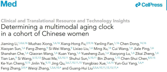 [12] Li J, Xiong M, Fu XH, Fan Y, Dong C, Sun X, Zheng F, Wang SW, Liu L, Xu M, Wang C, Ping J, Che S, Wang Q, Yang K, Zuo Y, Lu X, Zheng Z, Lan T, Wang S, Ma S, Sun S, Zhang B, Chen CS, Cheng KY, Ye J, Qu J, Xue Y, Yang YG, Zhang F, Zhang W, Liu GH. Determining a multimodal aging clock in a cohort of Chinese women. Med. 2023 Jul 24:S2666-6340(23)00197-6. doi: 10.1016/j.medj.2023.06.010. Epub ahead of print. PMID: 37516104.