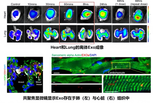 研究人員檢測了吸入的外泌體在小鼠體內的分布情況。檢測顯示,吸入的外泌體在10至60分鐘內迅速聚集在肺部與心臟。在60分鐘時,外泌體開始在心臟中累積,這種累積與肺部信號的減少同時發生,這表明外泌體持續穿過肺泡毛細血管屏障,被損傷的心肌募集。重復給藥能夠使得48小時后在心臟中仍然保留大量的外泌體。