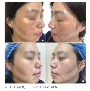 選2019年3月-2021年12月在筆者醫院接受參加本次研究的89例黃褐斑受試者,隨機分為實驗組(AOPT+EVS組)和對照組(AOPT組),過程24周。兩組PGA評分均有改善,實驗組改善率97.7%,對照組改善率93.3%;受試者滿意度實驗組88.6%,高于對照組的80.0%。新型強脈沖光應對黃褐斑效果確切,術后配合EVS外用可以在一定程度上提高應用效果。