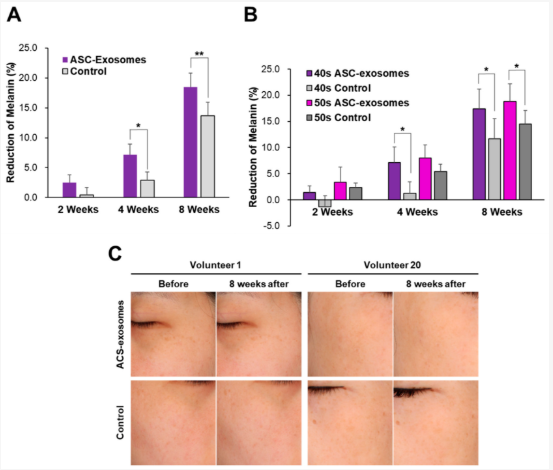 韓國學者選取21名不同年齡段的女性受試者,分為安慰劑組和實驗組,開展為期8周的研究。實驗組使用含脂肪間充質干細胞(ASC)外泌體的化妝品配方,安慰劑組使用不含ASC-外泌體的產品。結果顯示,實驗組的黑色素水平在接受應用后2周開始降低,4周后與安慰劑組有顯著性差異,8周后有極顯著性差異,且在50歲以下人群中黑色素水平的降低更為明顯,研究期間受試者均未發生任何不良反應。