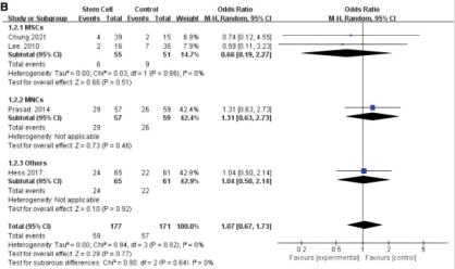 值得一提的是,所用干細胞類型有近一半為間充質干細胞(MSC,約6組),其余為骨髓單核細胞(MNC,約4組)及其他(4組),被研究者以不同亞型進行比較分析。