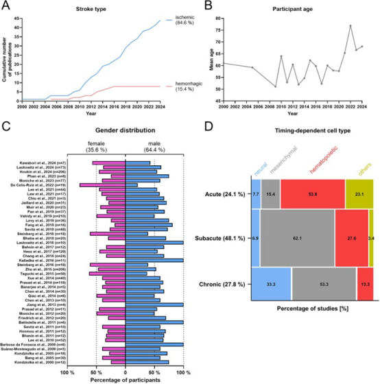 該研究對有關干細胞應對腦卒中的相關臨床試驗進行了全面檢索,在排除重復研究后,共有47項已發表的臨床試驗。其中,大多數研究(約85%)是在缺血性卒中受試者中進行的。此外,這些試驗主要涉及少量參與者,旨在評估安全性和可行性。除一項研究外,所有研究均未報告與細胞技術相關的顯著不良反應。