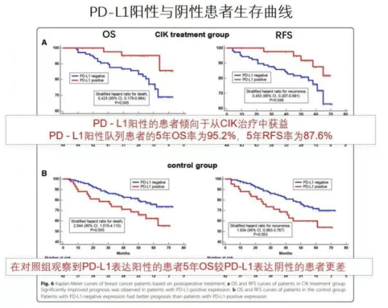 研究結(jié)果顯示,乳腺癌組織中表達高水平PD-L1的乳腺癌患者術后患者接受免疫細胞治療的療效更好。在CIK治療組,PD-L1陽性患者預后較好,即PD-L1陽性患者傾向于從CIK治療中獲益更大。PD-L1陽性隊列患者的5年OS率為95.2%,5年RFS率為87.6%。而在對照組中,PD-L1陽性患者預后較差,這與先前的研究結(jié)果一致,即PD-L1與不良預后相關。