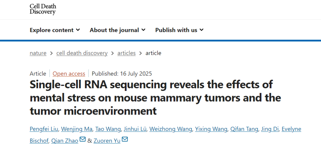近日,《Cell Death Discovery》期刊發(fā)表了一項題為《Single-cell RNA sequencing reveals the effects of mental stress on mouse mammary tumors and the tumor microenvironment》的重要研究,該研究通過單細胞 RNA 測序技術,首次系統(tǒng)揭示了精神壓力對小鼠乳腺腫瘤及腫瘤微環(huán)境的影響,為理解 “心理狀態(tài)與癌癥進展” 的關聯(lián)提供了全新的分子層面證據(jù)。