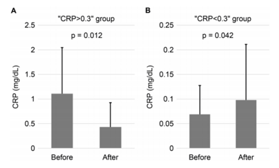 尤其值得注意的是,在那些治療前CRP水平高于正常范圍(>0.3 mg/dL)的受試者中,這種下降趨勢(shì)更為明顯。這表明,MSC外泌體可能通過(guò)調(diào)節(jié)免疫系統(tǒng)和抑制炎癥因子的釋放,有效緩解慢性炎癥,為應(yīng)對(duì)炎癥相關(guān)疾病提供了新的思路。