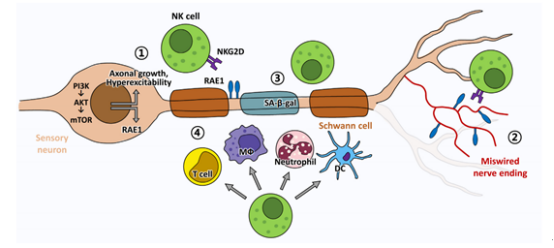 除了上述談及到的機制,NK細胞的另一個作用還可以在細胞衰老這個場景中發揮。在神經損傷后,一些神經細胞就會開始“衰老”,分泌相關的信號分子(例如SA-β-gal等等)。而這就是NK細胞“上陣”的信號,它們會定位并清除這些老化的細胞,防止它們引發慢性炎癥和纖維化,這兩者是神經性疼痛的重要風險因素。