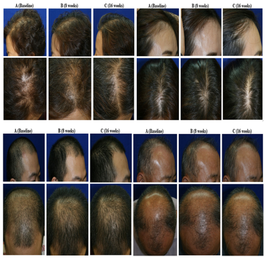 12名雄激素性脫發患者(男性7名,女性5名),年齡18-60歲,脫發等級為男性Norwood III-IV級或女性Ludwig I-II級。接受胎盤干細胞外泌體的臨床研究,每14天一次,最多4次。