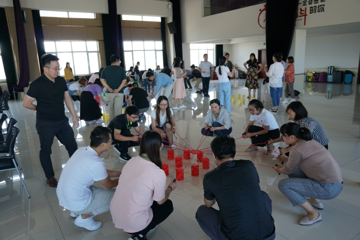 “合力建塔”活動以每隊五人到十人的小組形式進行比賽,要求團隊成員閉著眼合力操控繩子將所有積木豎直疊在一起并保持不倒,用時最短的隊伍獲勝。、