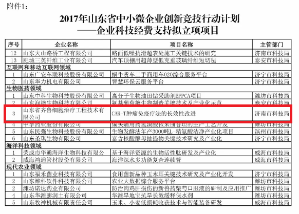 齊魯細胞治療公司中小微企業競賽項目“CAR-T腫瘤免疫療法的長效性改進”獲得山東省科技廳企業科技經費支持項目立項。
