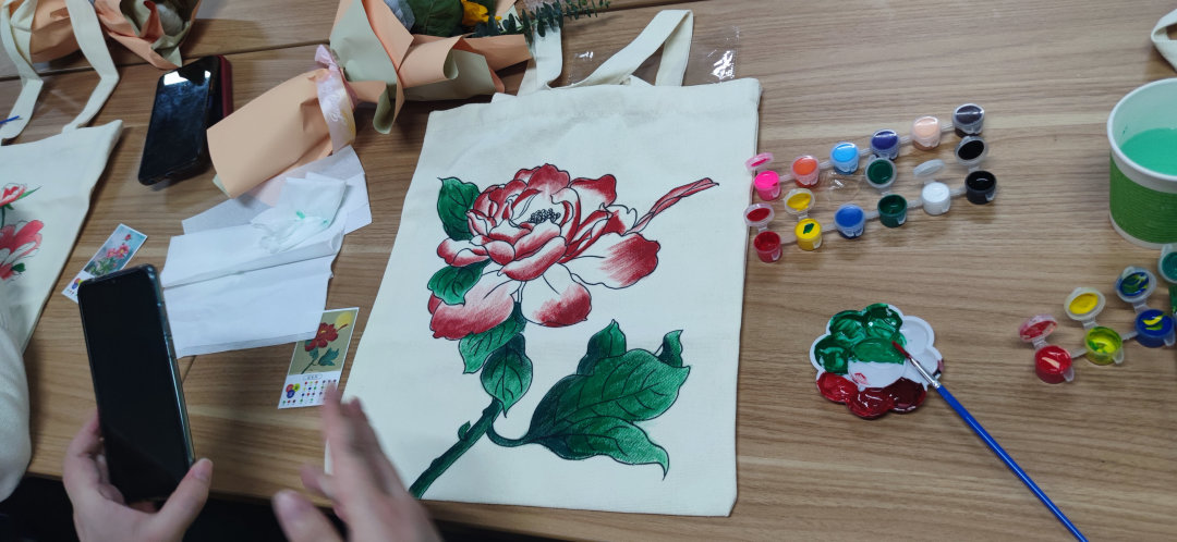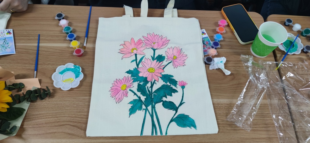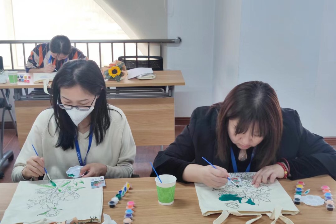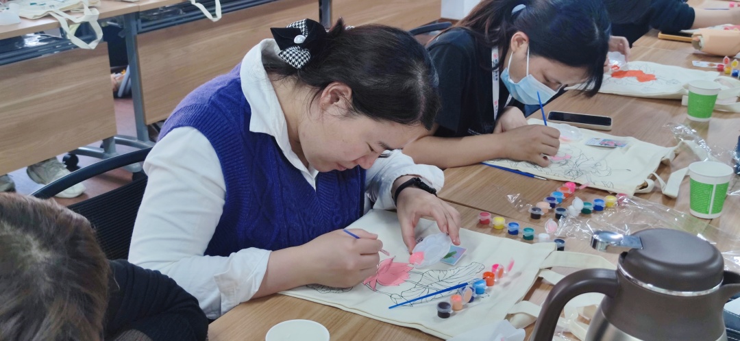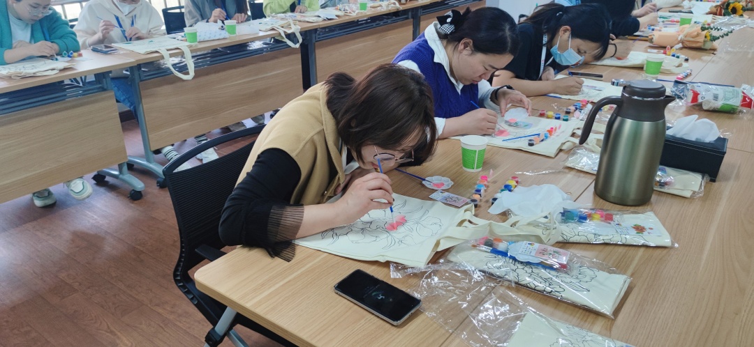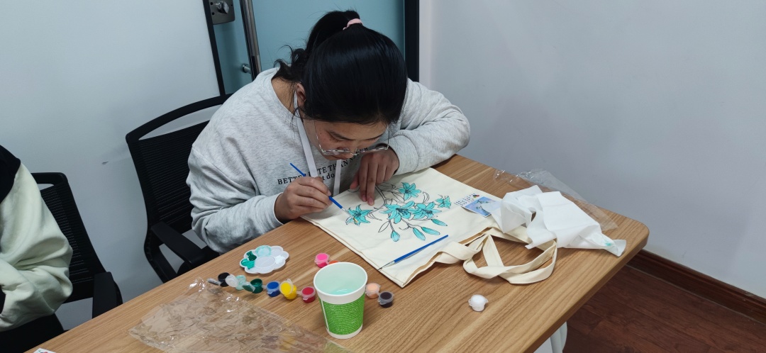 在場的同事很多都是第一次體驗手繪環(huán)布包,看他們沉浸在手工的樂趣中,現(xiàn)場氣氛也異?;钴S。很快一個個獨具匠心、創(chuàng)意個性、美觀大方的成品包包便在大家手中完成蛻變。