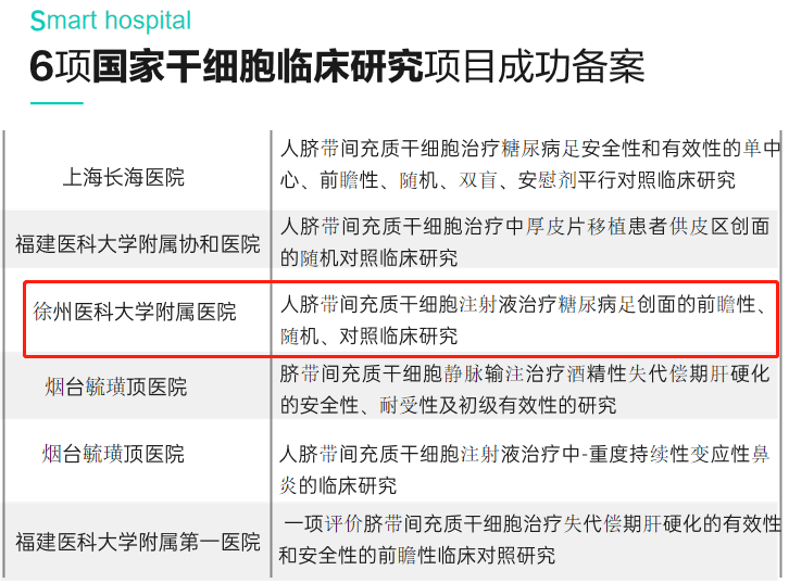 2021年,徐州醫科大學附屬醫院與齊魯細胞合作的《人臍帶間充質干細胞注射液治療糖尿病足創面的前瞻性、隨機、對照臨床研究》項目通過國家衛健委備案,并已于2022年3月正式啟動,這是全國第一個獲批的干細胞治療糖尿病足研究項目。