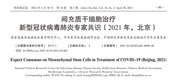 2021年,國內首個《間充質干細胞治療新型冠狀病毒肺炎專家共識》(以下簡稱《專家共識》)定稿并發布,《專家共識》是根據干細胞治療COVID-19的最新臨床研究進展,聯合病毒學、免疫學、感染病學、呼吸病學、流行病學、影像學、藥理毒理學和干細胞治療等領域的多方專家建議,集體討論形成。