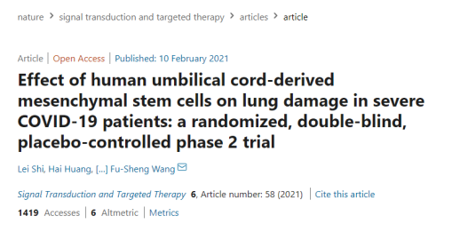 王福生院士牽頭開展的“間充質干細胞治療新冠肺炎的臨床研究”,其團隊在Nature子刊《Signal Transduction and Targeted Therapy》上報道了關于人臍帶間充質干細胞(UC-MSCs)治療重型新冠肺炎(COVID-19)患者的隨機、雙盲、安慰劑對照、Ⅱ期臨床試驗研究。