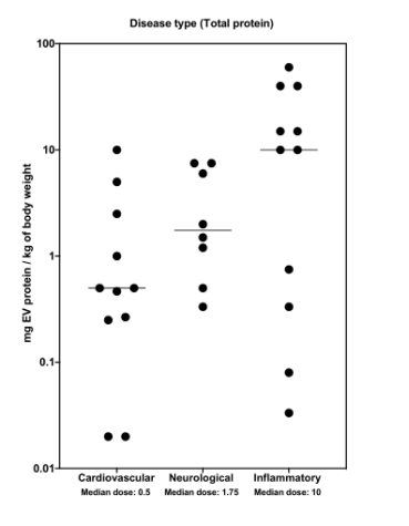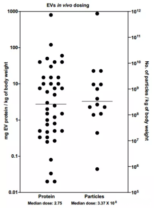不同的實驗動物(大鼠、小鼠、豬)、給藥途徑(系統性/局部)、研究領域(心血管、神經、炎癥、癌癥)等,臨床前以及臨床上所用的EVs劑量大有考究。