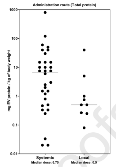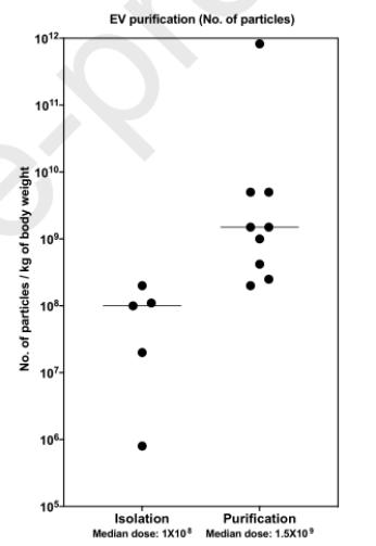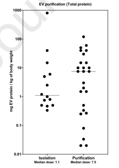 直接分離方法(如沉淀或超濾),根據大小或密度使用EVs純化方法(超離、尺寸排阻等),用于EVs純化的技術會影響最終制備中外泌體的總蛋白質數量。有趣的是,使用直接分離方法(如沉淀或超濾)的研究中的中位治療劑量比使用基于大小或密度的EVs純化方法的研究低約10倍。