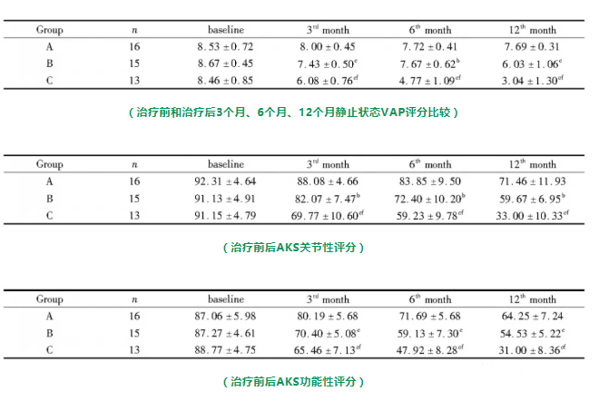 該項實驗中共有119例患者,經過40個月的隨訪,發現患者體內促炎細胞因子相對于基線顯著降低,同時注意到KOOS疼痛、癥狀和生活質量以及WOMAC僵硬度分量表評分相對于基線有顯著改善。
