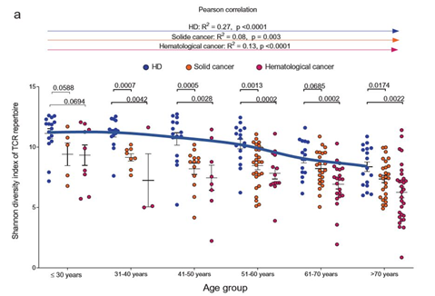 △藍(lán)色線為健康人T細(xì)胞多樣性趨勢(shì)
