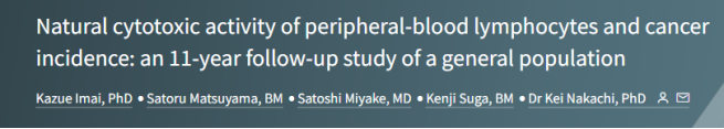 [1] Imai, K., Matsuyama, S., Miyake, S., Suga, K. & Nakachi, K. Natural cytotoxic activity of peripheral-blood lymphocytes and cancer incidence: an 11-year follow-up study of a general population. The Lancet 356, 1795–1799 (2000).