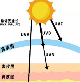 陽光中的紫外線根據其波長主要分為三種:長波紫外線( UVA ,320-400nm)、中波紫外線( UVB ,280-320nm)和短波紫外線( UVC ,180-280nm)。其中 UVC 在穿過臭氧層時幾乎被完全吸收,到達地面的僅為 UVA 和 UVB ,分別占總量的95%和5%。