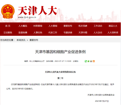 《天津市基因和細胞產業促進條例》已由天津市第十八屆人民代表大會常務委員會第四次會議于2023年7月27日通過,現予公布,自2023年9月1日起施行。